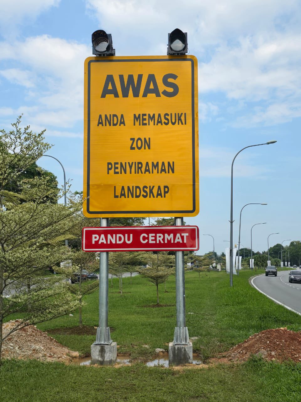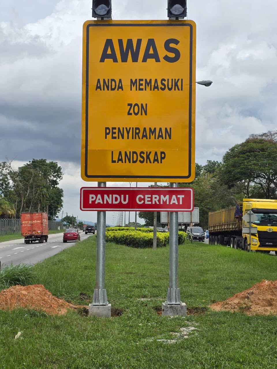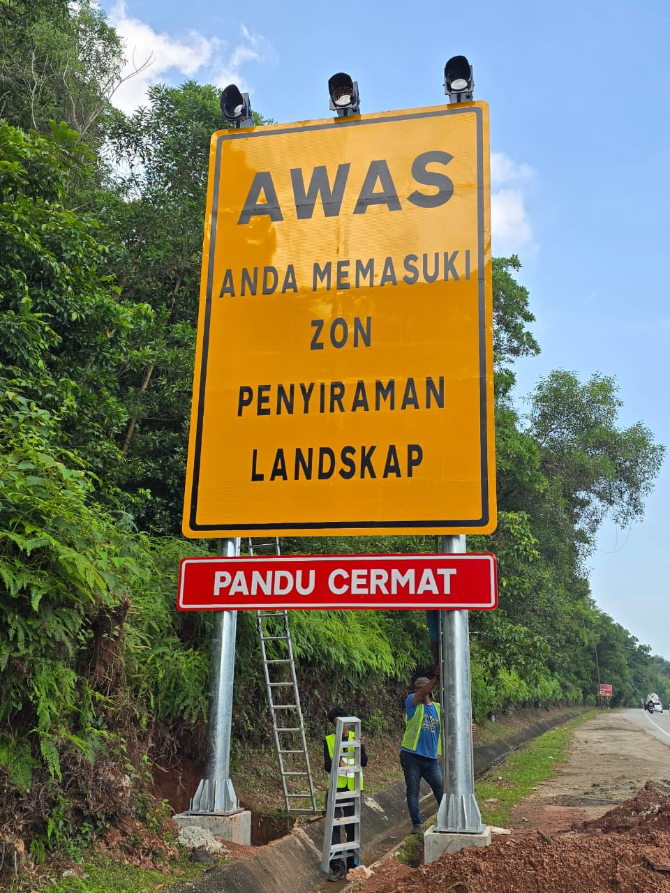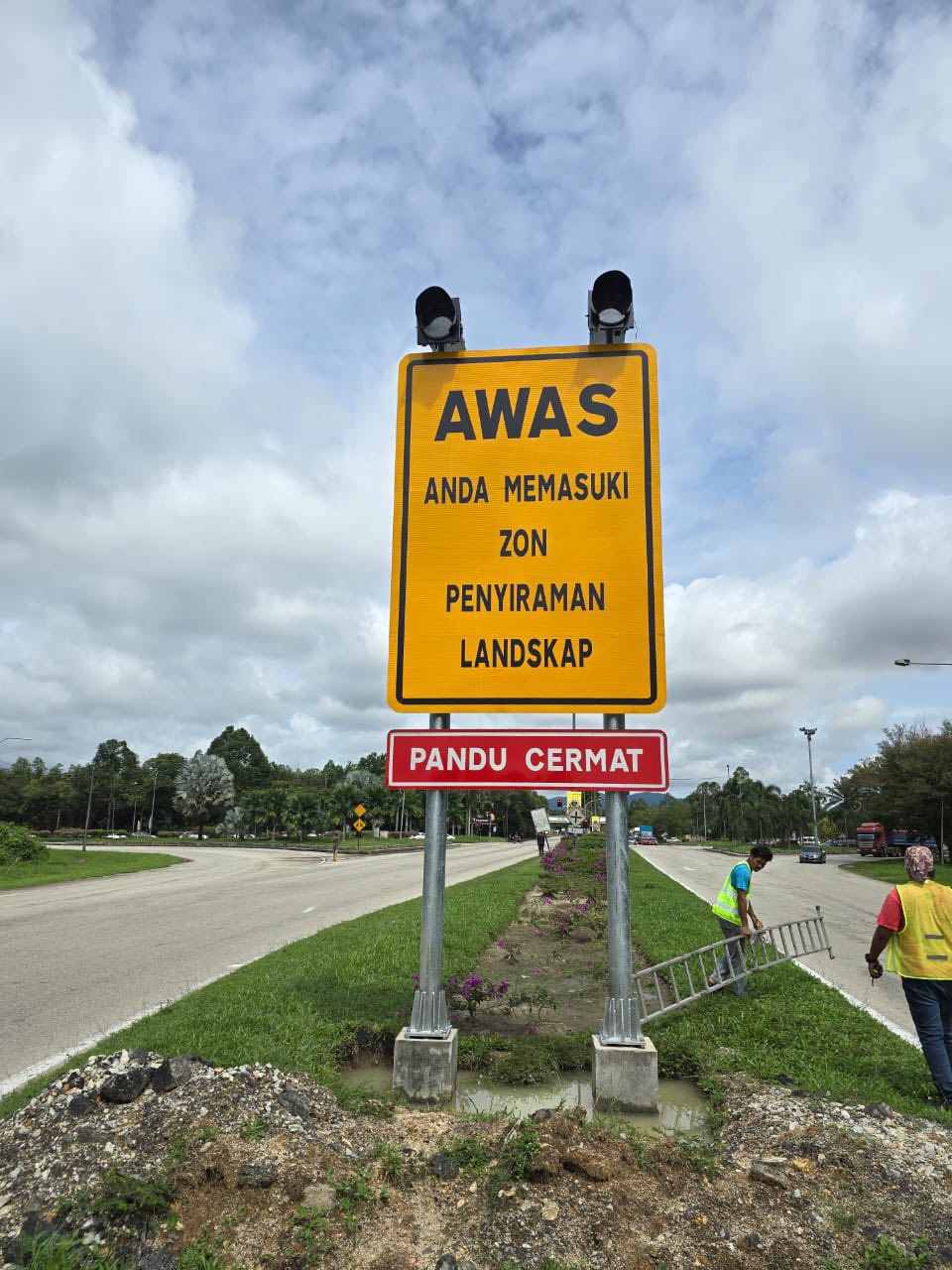 05 Disember 2025 | Jumaat – Majlis Bandaraya Kuantan (MBK) telah melaksanakan pemasangan papan tanda amaran baharu bagi memaklumkan para pengguna jalan raya berhubung aktiviti penyiraman landskap yang dijalankan di sepanjang laluan berkenaan.