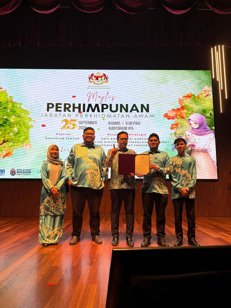 25 September 2025 | Khamis – Pihak majlis menerima Sijil Penghargaan bagi penyertaan Inisiatif Dalam Dashboard H.E.M.A.T yang dianjurkan oleh Jabatan Perkhidmatan Awam Malaysia (JPA). Sijil Penghargaan ini telah disampaikan oleh YBhg. Tan Sri Wan Ahmad Dahlan bin Haji Abdul Aziz, Ketua Pengarah Perkhidmatan Awam kepada YH. Dato’ Ts. Gs. Dr. Mohd Zakaria bin Ibrahim, Timbalan Setiausaha Kerajaan Pahang (Pengurusan). Sebanyak 4 kumpulan Inovasi MBK yang menerima sijil penghargaan tersebut.