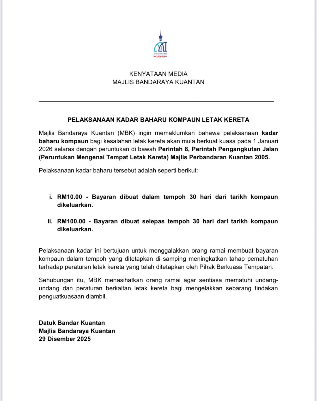 Terkini! Kenyataan Media Pelaksanaan Kadar Baharu Kompaun Letak Kereta